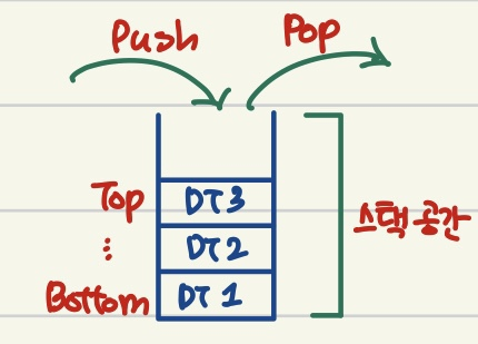 - 후입 선출(Last In First Out, LIFO) 자료구조: 마지막에 들어온 데이터가 먼저 나감