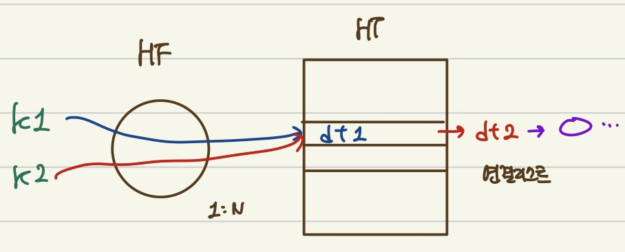 • ==> 서로 다른 키의 해시 함수를 통한 해시 값이 동일할 경우