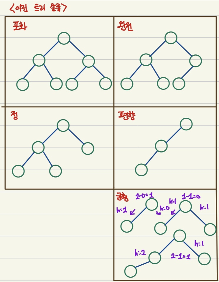 - 균형 이진 트리(Balanced Binary Tree): 모든 노드의 좌우 서브 트리 높이가 1이상 차이나지 않는 트리(탐색속도 빠름)