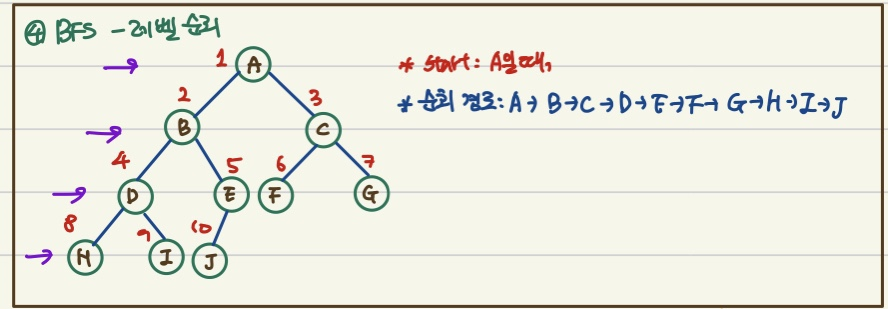 - 방문 순서: 위쪽 레벨부터 왼쪽 노드 → 오른쪽 노드