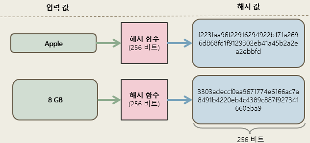 • 각 16진수 자리는 4비트로 표현되므로 16진수로 표현된 숫자의 개수(64개)를 4로 곱하면 256 비트의 해시 값을 만들 수 있음
