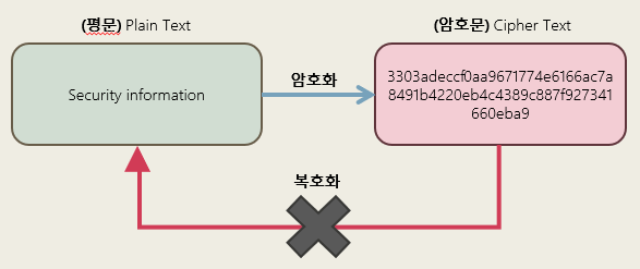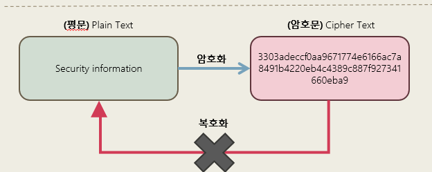 • 입력에서 출력으로 향한느 단방향 암호 알고리즘을 사용하기 때문