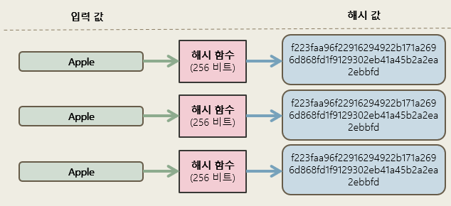 • 다음과 같이 동일한 입력 값을 반복해서 넣어도 해시 함수의 결과는 변하지 않음
