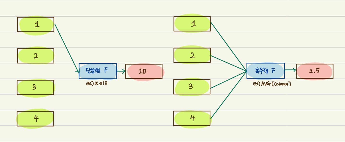 * ORACLE 기준 함수 정의*01. 함수 정의INPUT VALUE → (FUNCTION) → OUTPUT VALUEFUNCTION: INPUT VALUE와 OUTPUT VALUE의 관계를 정의한 객체FROM절을 제외한 모든 절에서 사용 가능02. 함수 기능기본적인 쿼리문을 더 강력하게 만듬데이터의 계산을 수행개별 데이터의 항목을 수정표시할 날짜 및 숫자 형식을 지정열 데이터의 유형(DATA TYPE)을 변환03. 함수의 종류 - 입력값의 수에 따라 분류단일행 함수: INPUT과 OUTPUT의 관계 = 1:1복수행 함수: 여러 건의 데이터를 동시에 입력받아서 하나의 요약값을 리턴같은 용어: 그룹 함수, 집계 함수04. 함수의 종류 - 입/출력값의 타입에 따라 분류문자형 함수문자열 결함, 추출, 삭제..